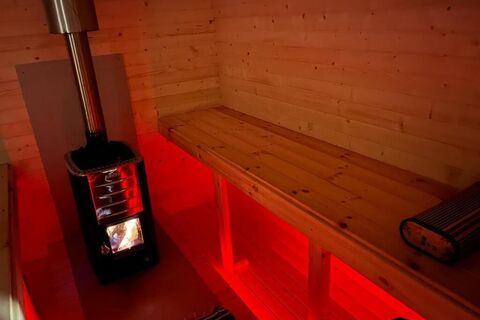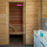 Also located on the ground floor is a spacious bathroom with an original stone pine sauna with combi oven. This allows both the classic Finnish sauna and a cozy hot air bath with herbal essences according to your wishes!