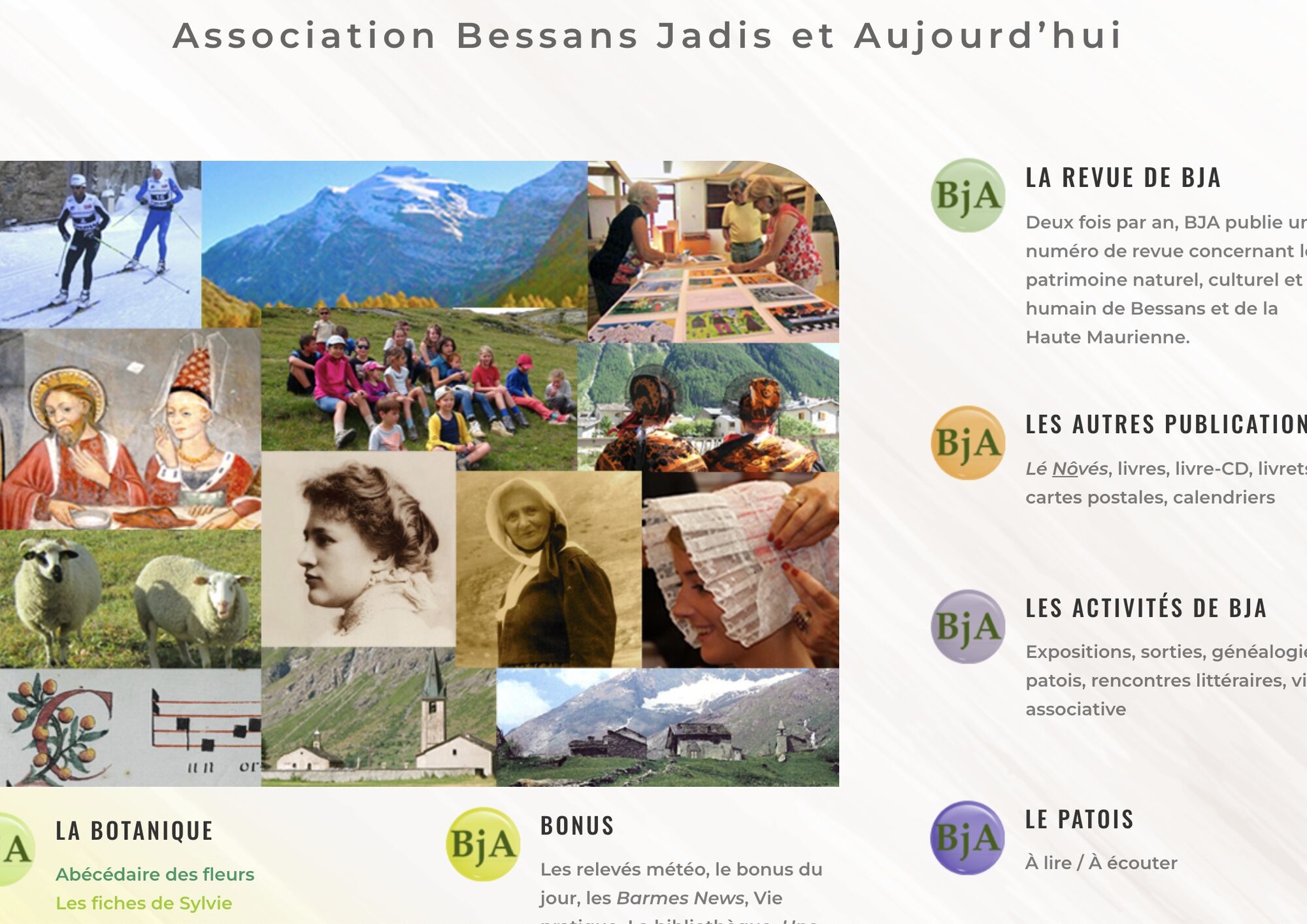- un site internet : www.bja-bessans.fr qui rend compte de toutes ces activités et productions. Il propose des expositions de photos selon un principe de collaboration, notamment pour les identifications et les datations, un vocabulaire sonore du patois bessanais et de nombreuses autres rubriques.