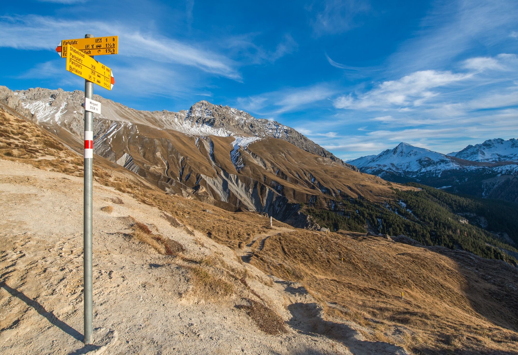 À partir de l'alpage, le parcours monte en zigzag à travers le God da Margunet. Plus haut, le chemin s'adoucit et s'ouvrent des vues fantastiques sur les Murteras da Stabelchod en face, au-dessus de la limite de la forêt, où l’on peut souvent observer des chamois ou des cerfs. Le chemin continue vers la place de repos Val da Stabelchod. À partir de cette place, la pente reprend et le chemin monte en long zigzag à travers des prairies d'edelweiss et de gentiane jusqu'à Margunet (2328 m d'alt.), où un panorama impressionnant vous attend.