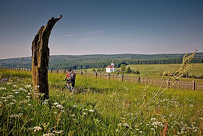 Au départ du centre de Bozi Dar (Gottesgab), nous suivons la route 23 et passons devant les domaines skiables de Neklid et Klínovec (Keilberg 1244 m), le plus haut sommet des Monts Métallifères. Depuis le plateau panoramique avec sa tour d'observation reconstruite et rouverte en 2013, on a une vue panoramique sur les Monts Métallifères et une grande partie du nord de la Bohême. En longeant d'autres milliers de mètres, on arrive sans effort à Měděnec (Kupferberg ). Ici, on peut voir des produits miniers et des minéraux dans la mine pour visiteurs. En continuant à descendre, nous arrivons au barrage de Pressnitz, réservoir d'eau potable pour les habitants de la vallée de l'Eger et de la Bohême du Nord. Ici, nous bifurquons au niveau du barrage de 50 m de haut et nous nous dirigeons vers Jelení Hora (Haßberg 993 m) en montant le long de la frontière germano-tchèque et de la région des tourbières jusqu'à Načetin (Natschung) et ensuite jusqu'à Kalek (Kallich), un petit village de montagne à 700 m d'altitude avec une église de montagne visible de loin. L'étape se termine dans le village frontalier.
