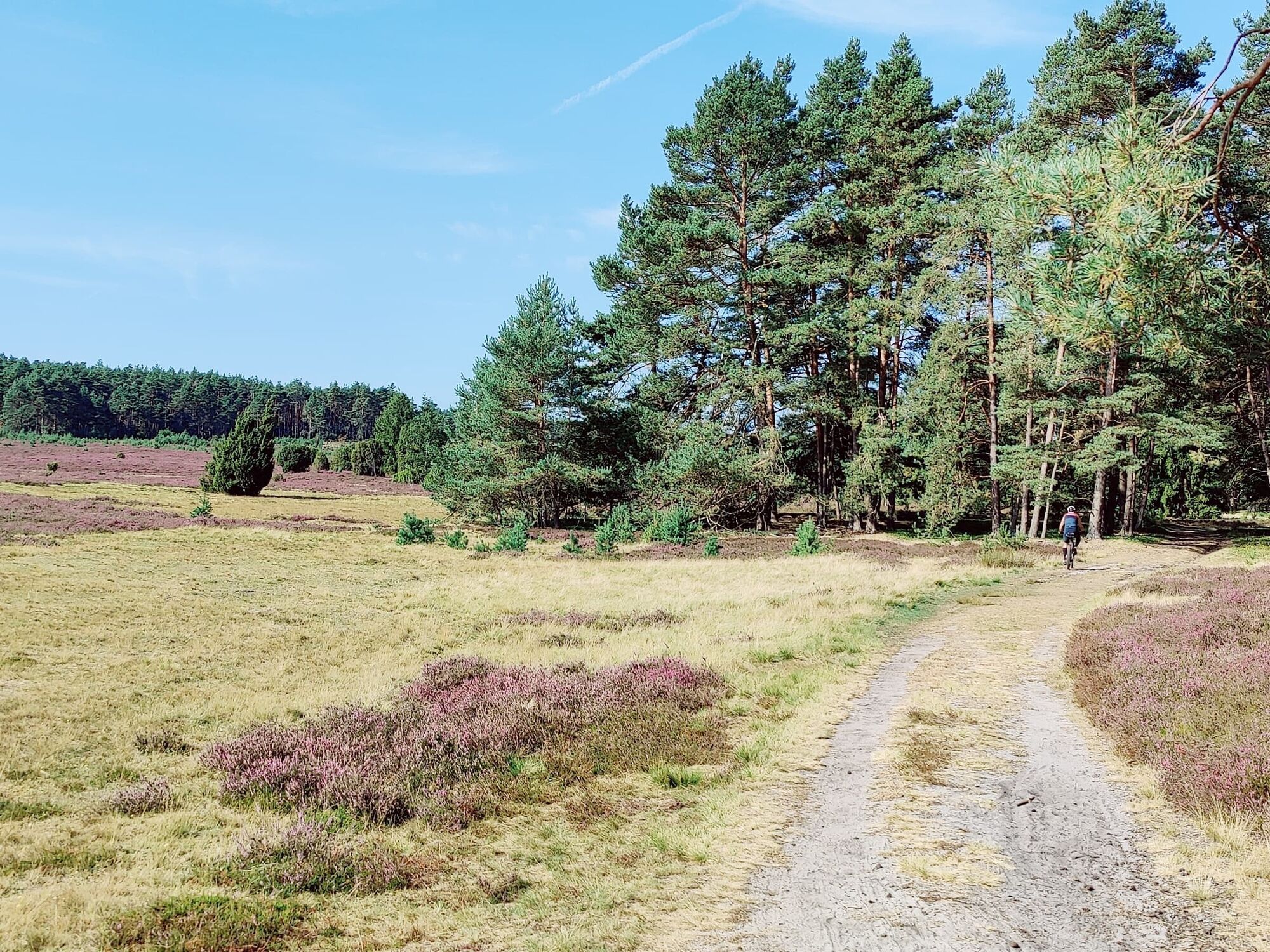 Der Untergrund wechselt ständig: Mal Asphalt, mal Feldwege mit festem Sandboden, Grasbüschel, Schotter – nie langweilig. Kleine Dörfer mit Rastplatz laden zur Pause ein, Apfelbaumalleen spenden Schatten und im Herbst leckeres Obst. Große Heideflächen ziehen zur Blütezeit viele Wanderer an. Gravelbiker:innen nehmen Rücksicht. Der Track führt bewusst nicht zu allen Hotspots. Durch den Lüßwald mit gewaltigen Baumriesen zum Museumsdorf mit Waldgeschichtspfad. Wer kann: unbedingt länger bleiben. Die "Alte Schule" mit Café und Übernachtung liegt am Weg.