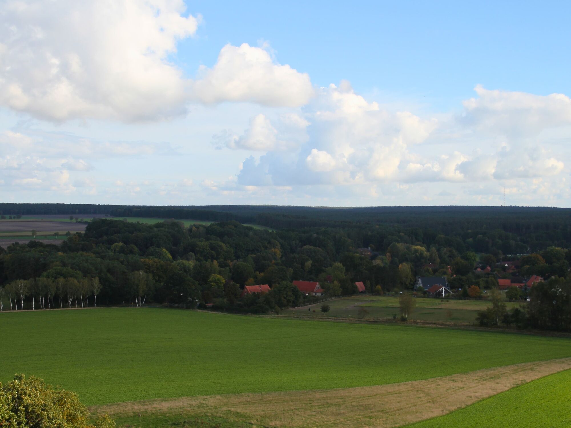 Über asphaltierte Wirtschaftswege rollst du durch weite Felder in die ersten Dörfer. Immer wieder geht es leicht bergauf und bergab – die Reste der letzten Eiszeit lassen grüßen. Du fährst durch den urwüchsigen Lüßwald, eines der größten zusammenhängenden Waldgebiete Deutschlands.