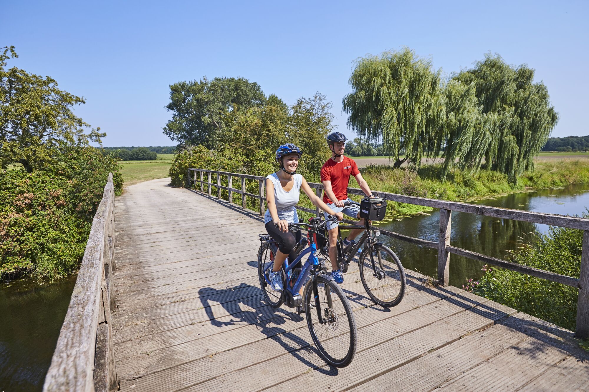 Auf gut ausgebauten Radwegen geht es weiter der Vechte entlang in Richtung Schüttorf, der ältesten Stadt der Grafschaft Bentheim. Hier gibt es den „Schüttorfer Riesen“, den höchsten Kirchturm der Grafschaft zu besichtigen. Zu einem Shoppingstopp lädt die einstige Textil- und heutige Wasserstadt Nordhorn ein, deren komplette Innenstadt von der Vechte wie eine Insel umschlossen wird.