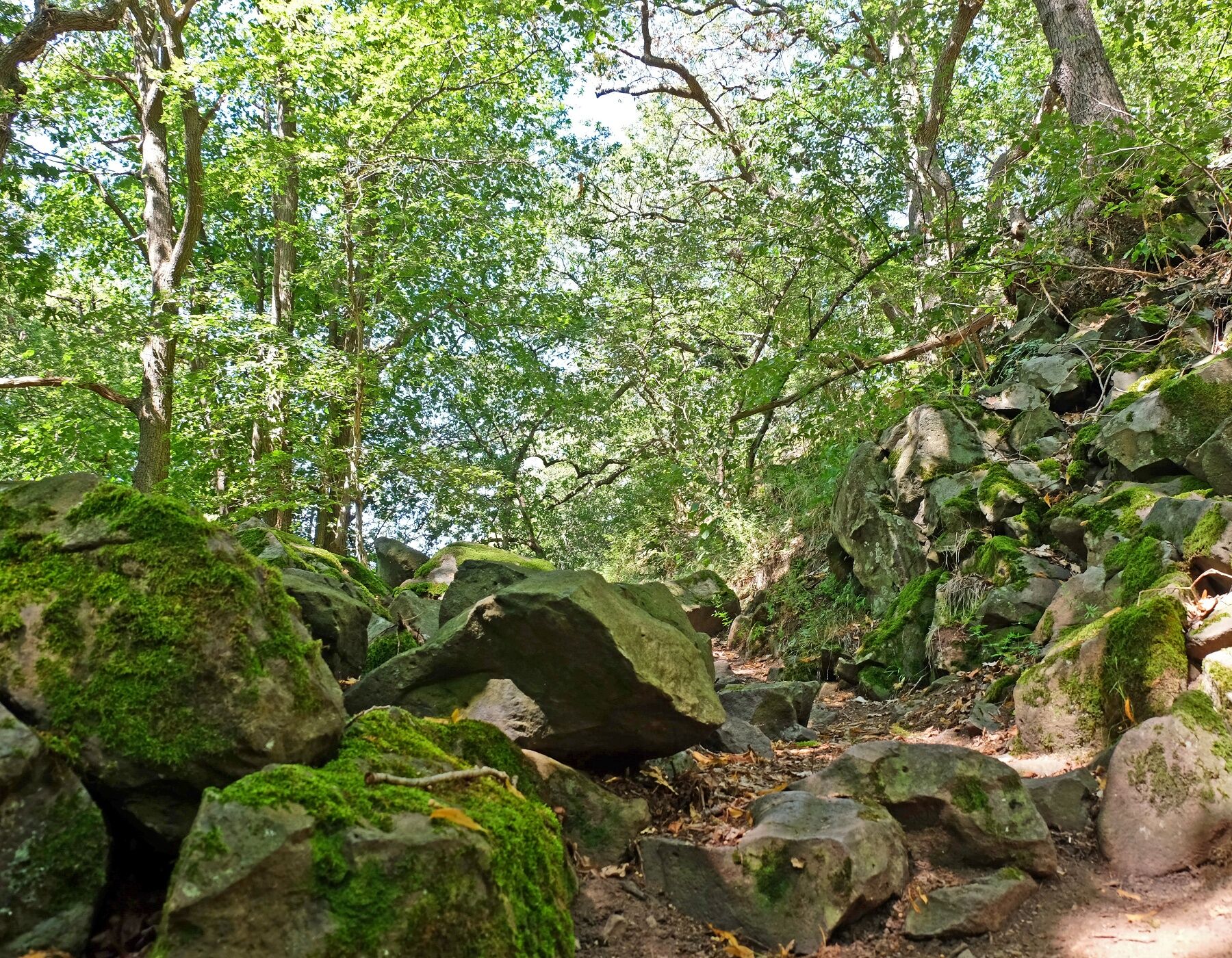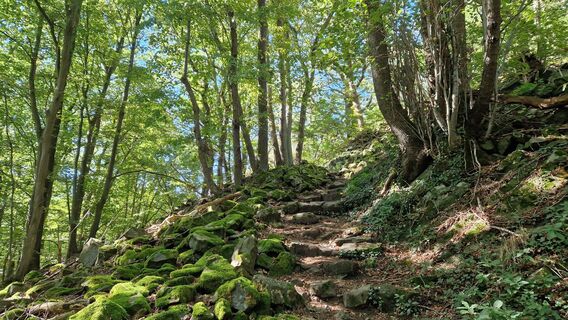 Durch Bad Honnef folgst du durch eine Art Park dem Annapfad am Ohbach entlang bergauf. Ein bequemer Waldweg bringt dich auf den rund 150m höher gelegenen Leyberg. Oben solltest du unbedingt die Aussicht vom Gipfelfelsen genießen. Ein am Ende herrlich steinreicher Pfad führt dich rauf. Den Himmerich erreichst du über die einsame Waldstraße "Mittelbergsweg". Auch hier lohnt sich ein Absticher zum Aussichtspunkt, dort ist auch Platz für ein Picknick. Jahrzehntelanger Abbau von vulkanischem Latitgestein formte den Berg mit seinen steil aufragenden Felswänden. Runter ins Schmelztal geht es zum Teil über einen schönen Singletrail, die Gegenüberliegende Hangseite bringt dich auf einem schönen waldweg zuück nach Bad Honnef.