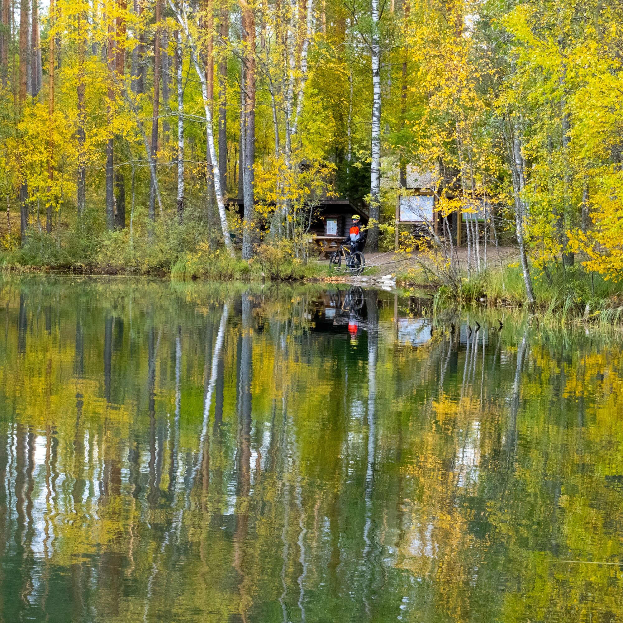 Le parcours Matkalampi s’étend sur 16 km et comprend, en plus des sentiers d’aiguilles, des pistes de ski, des chemins de charrette, des sentiers de crête pavés de petites pierres, quelques portions de route en gravier et un superbe sentier au bord du lac Sompalampi, où se trouve aussi un autre abri du parcours.