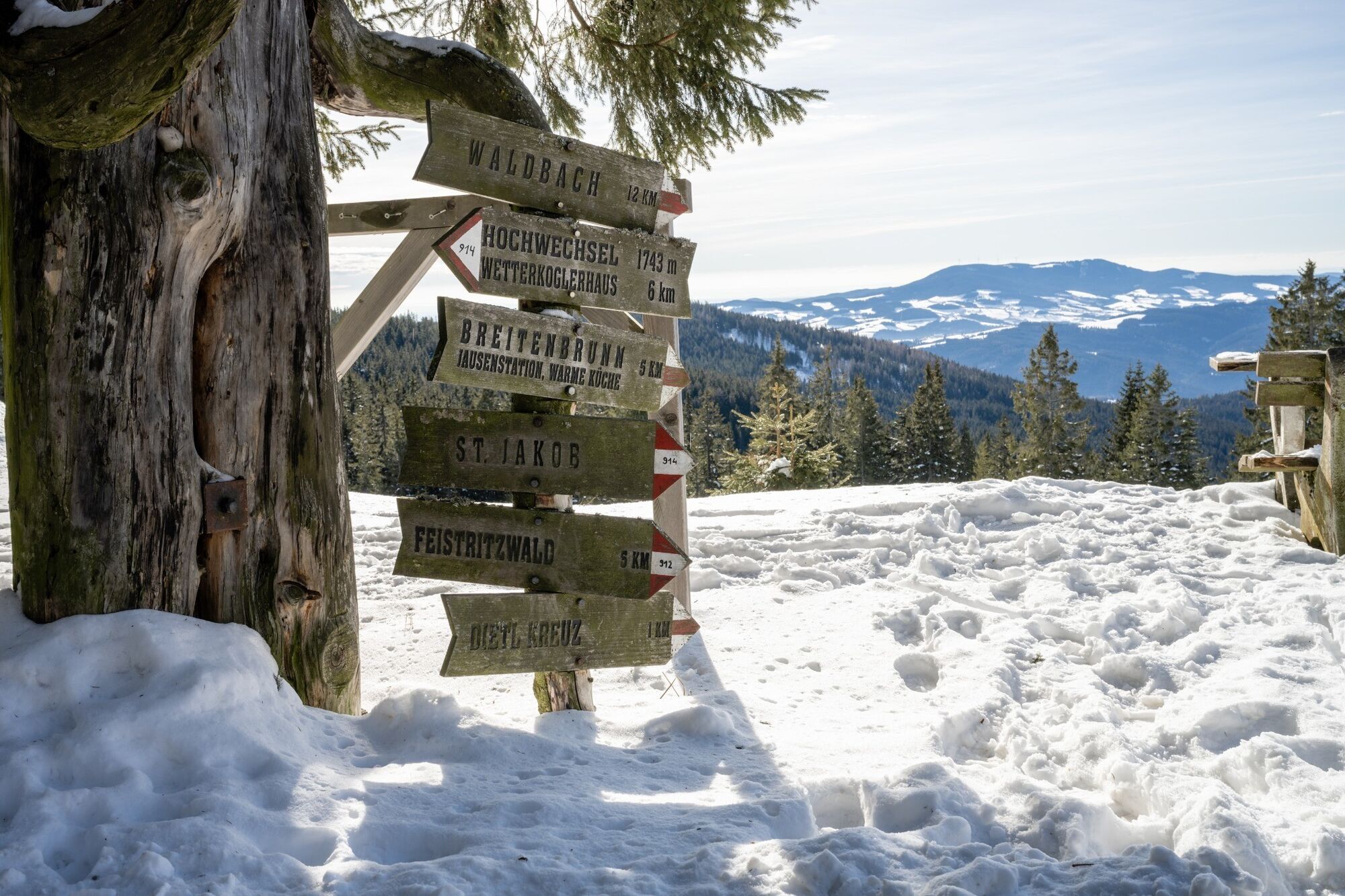 Wir starten bei der Rabl-Kreuz-Hütte, von dort weg folgen wir dem Wanderweg Nr. 912Auf der präparierten Naturrodelbahn gehen wir bis zu einer Wegkreuzung, an der werden wir von einer Skulptur aus Wegweisern empfangenWir orientieren uns and der Holztafel mit der Aufschrift "Hochwechsel Wetterkoglerhaus" und gehen in der Waldschneise weiter bergaufAuf einer großen Wiesenfläche zeigen uns gewöhnlich viele Spuren den weiteren WegAm Gipfel angekommen können wir eine herrliche Aussicht über die Region Joglland - Waldheimat genießenIm Winter ist das Alpenvereinshaus Wetterkoglerhaus geschlossen, jedoch können wir uns an der Rückseite des Hauses in einem Winterraum wärmenNach einer kurzen Verschaufpause gehen wir auf demselben Weg zurück zur Rabl-Kreuz-Hütte